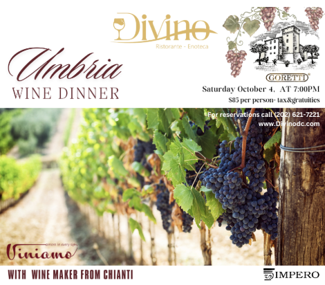 On Friday, October 4th, experience an unforgettable four-course dinner paired with exceptional wines from Cantine Goretti, one of Umbria’s most celebrated family-owned wineries. For just $85.00 per person, guests will enjoy a curated menu where each dish is thoughtfully matched with a wine that highlights the rich terroir of central Italy. With over four generations of winemaking tradition, Cantine Goretti is renowned for producing elegant, expressive wines that capture the heart of Umbria’s rolling hills and ancient vineyards.