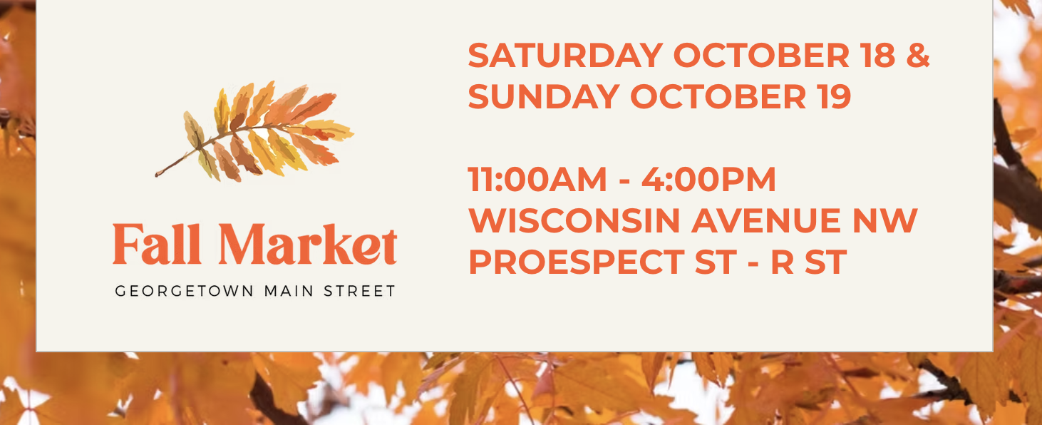 Come to Georgetown at Book Hill and all along Wisconsin Avenue from N Street to Reservoir Road on October 18th and 19th from 11:00 a.m. to 4:00 p.m. for small business promotions, fall-inspired menus, and autumnal activities for all to enjoy.