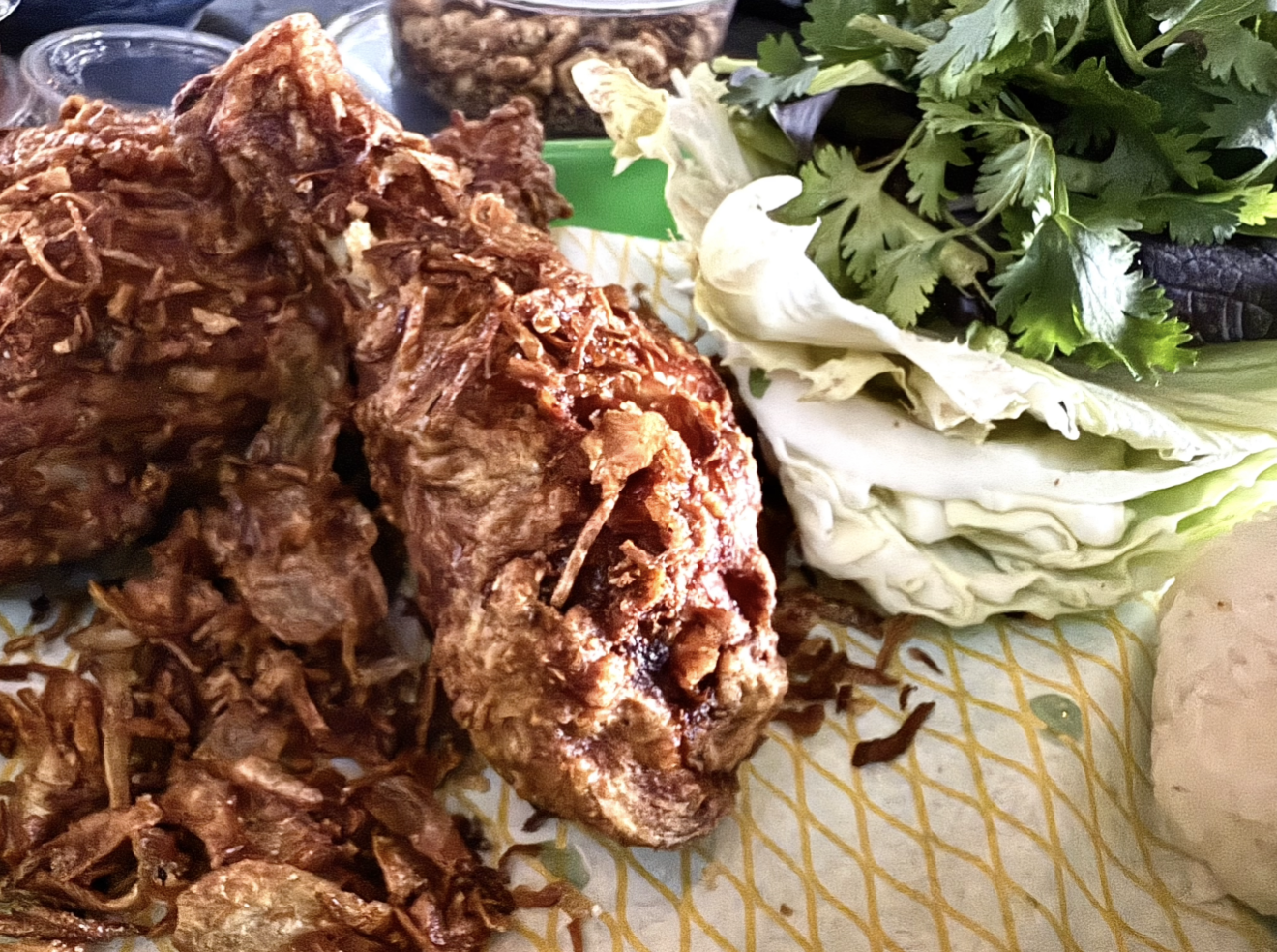 Late lunch and much-needed hydration came courtesy of SS Gai Street Thai—grilled peanuts, pounded charred eggplant, and that Southern fried chicken. Also, fresh coconut water straight from the coconut. Exactly what my body needed.