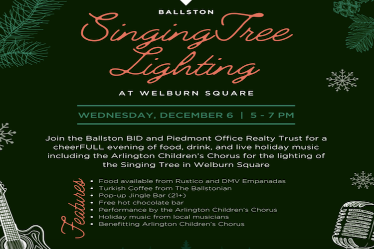 The Ballston BID, in partnership with Piedmont Office Realty Trust, will host its second annual holiday celebration from 5:00 - 7:00 p.m. The event will feature a tech-enabled Singing Tree alongside a performance by the Arlington Children's Chorus. The Singing Tree, which will be on display in Welburn Square throughout the month, is a voice activated Christmas tree that lights up when it hears music. The event is free and open to the public. For more information, click here.