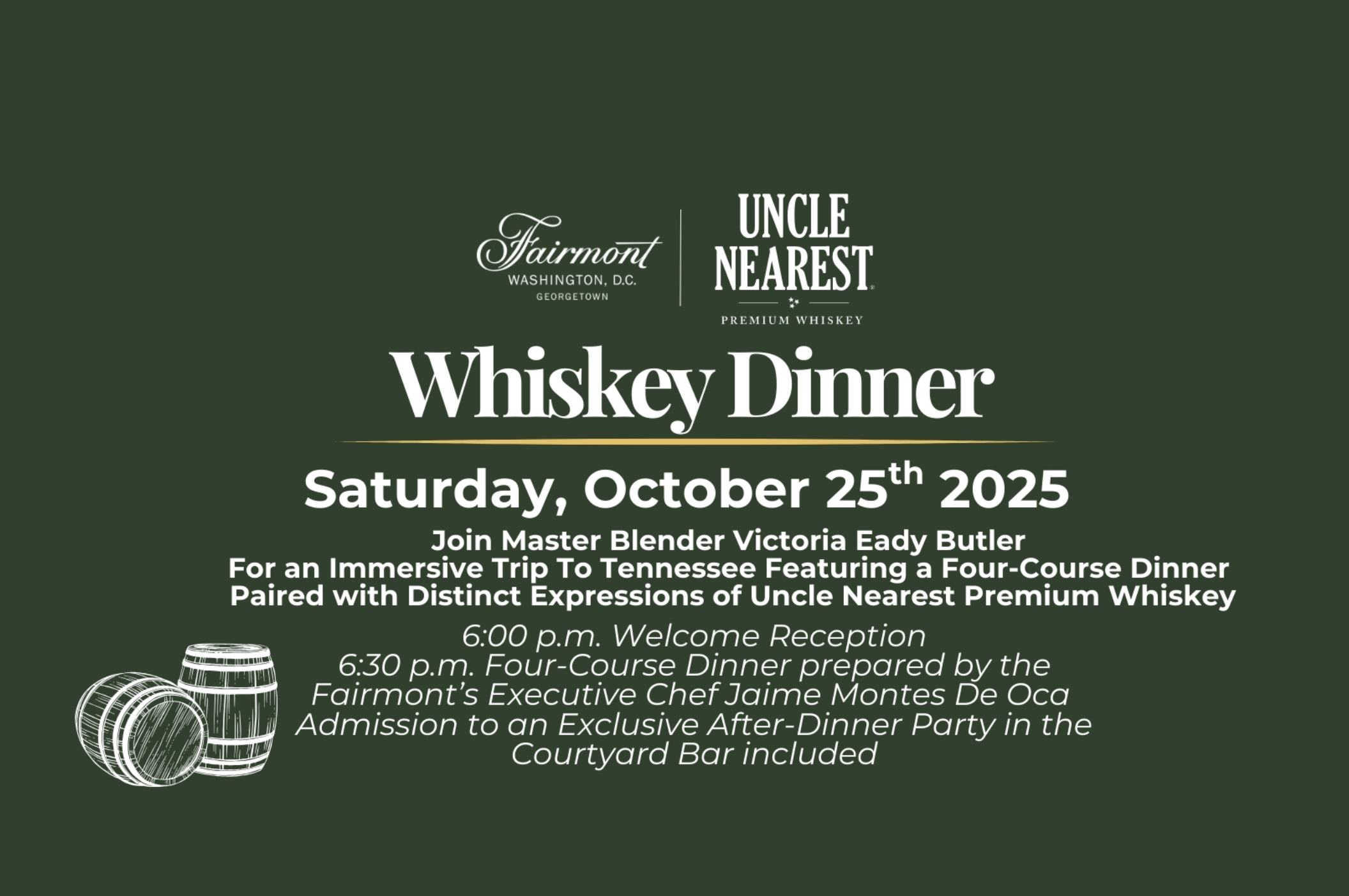 On Saturday, October 25, at 6:00 p.m., experience “A Trip to Tennessee” at Fairmont Washington D.C., Georgetown, an unforgettable whiskey dinner that brings the heritage and hospitality of Uncle Nearest Premium Whiskey to life.
