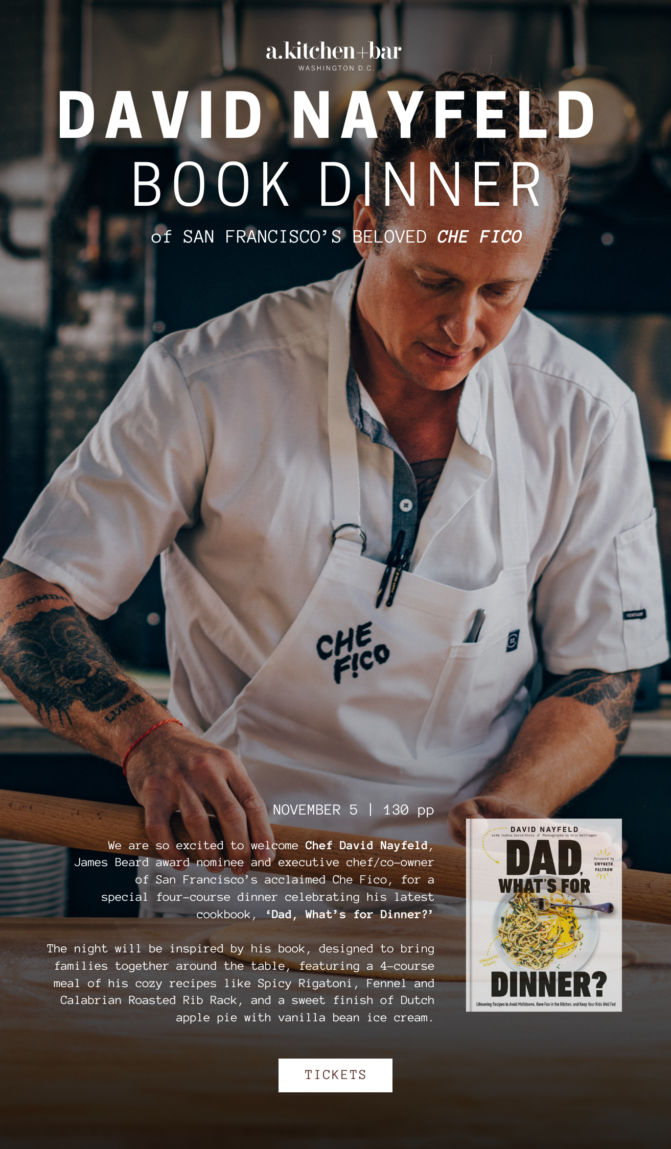 Join Chef David Nayfeld, James Beard Award nominee and executive chef/co-owner of San Francisco’s beloved Che Fico, for a special evening at a.kitchen + bar on Wednesday, November 5th at 6:30 PM. The celebrated chef will host an intimate four-course dinner inspired by his new cookbook, Dad, What’s for Dinner?, a collection of recipes designed to bring families together around the table.