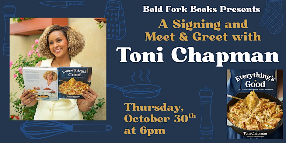 Join for an unforgettable night as Bold Fork Books welcomes Toni Chapman, creator of TheMoodyFoody and debut author of Everything’s Good. Meet Toni in person and get your signed copy of her highly anticipated cookbook. Sip on a custom cocktail crafted with Ten to One Rum—Toni’s treat to you. Celebrate the release of the book that’s redefining comfort food and hosting for a new generation. This is more than a signing—it’s your chance to connect with Toni, raise a glass, and be part of a community that knows when food is shared, everything’s good. To purchase a ticket, click here.