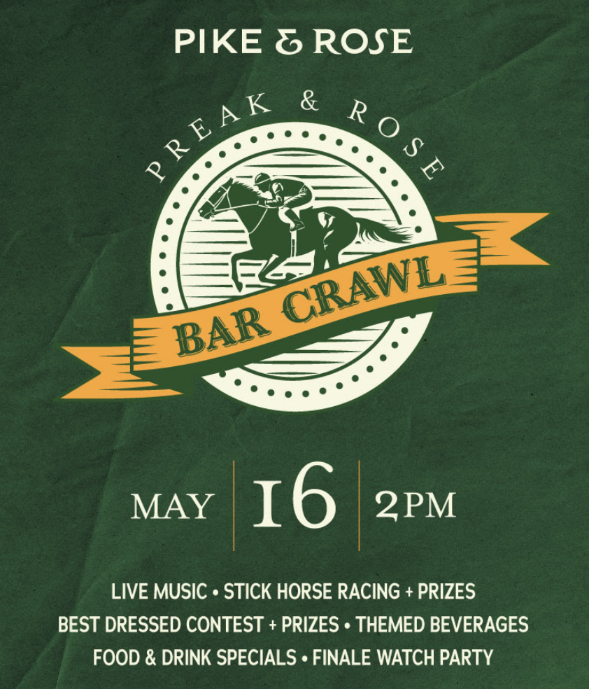 lCelebrate Preak & Rose Bar Crawl with a fun, fast-paced team challenge around Pike & Rose. Grab your crew, hop on your stick horse, and race your way through participating locations for a chance to win prizes. Grab a crew--teams of 2 to 5--and “race” around Pike & Rose, completing activities at each stop. The first three teams to complete all activities + post & tag will win prizes, including $500 in gift cards and a $100 tab at a participating bar of choice to be redeemed on day of event only.