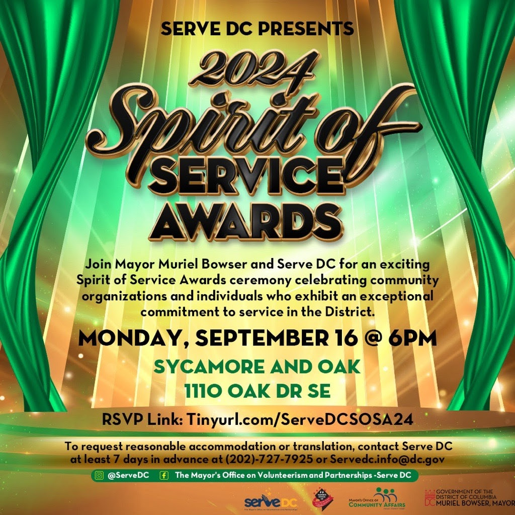 Join Mayor Muriel Bowser and ServeDC at the 2024 Spirit of Service Awards. The event celebrates and honors District residents, community-based organizations, and businesses that have displayed an outstanding commitment to service in the areas of volunteerism, national service, philanthropy, and community resilience. This event is FREE admission. Please note, that this is a formal/ black tie event. Rsvp to the event HERE